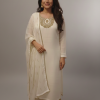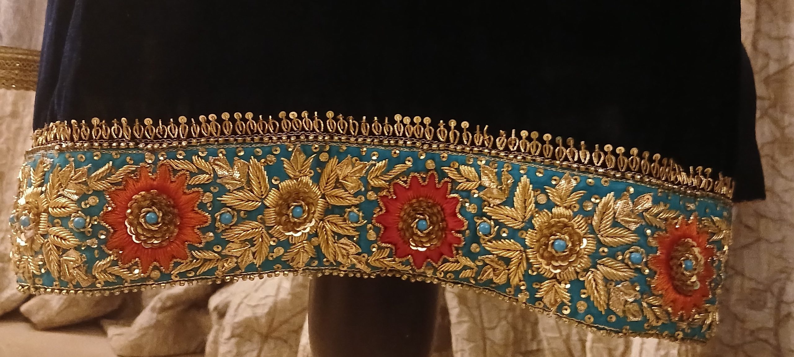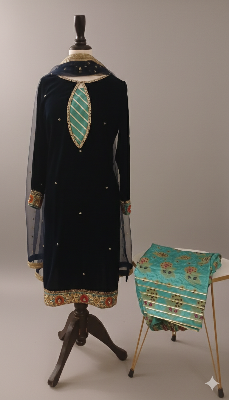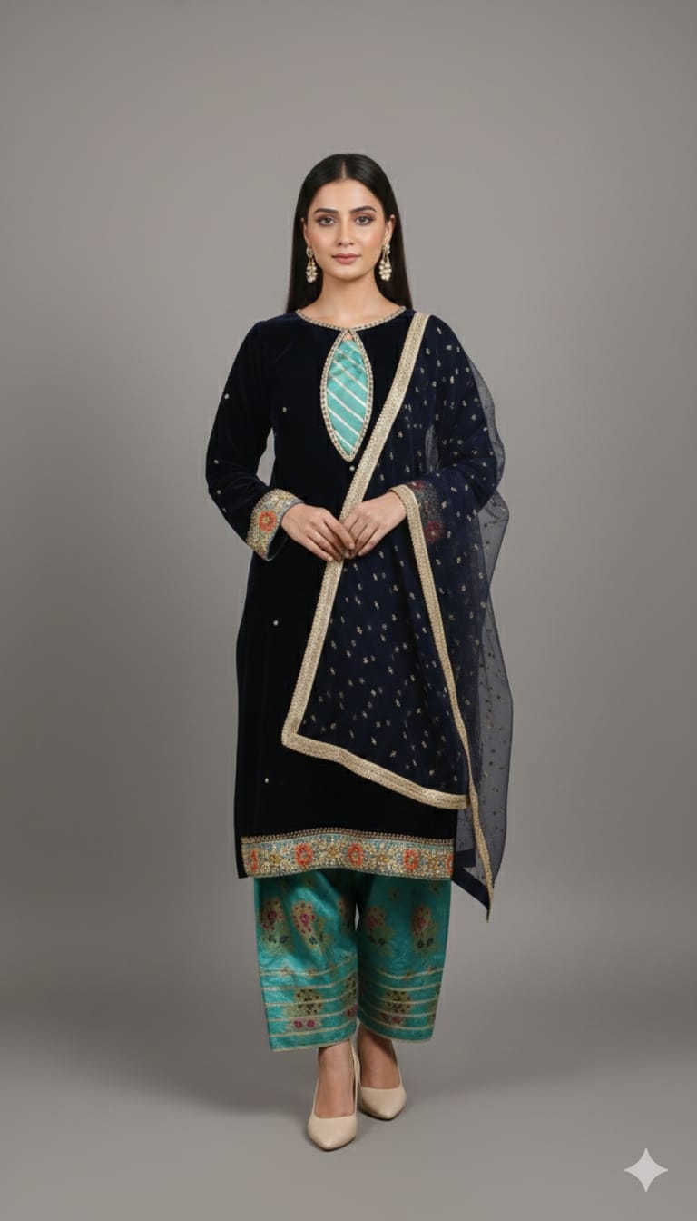 Indulge in timeless elegance with this luxurious three-piece ensemble, thoughtfully designed for festive and formal occasions. The rich velvet shirt is meticulously hand-embellished, showcasing intricate detailing that adds depth, texture, and a refined glow to the silhouette.Paired with an opulent Atlas Banarsi shalwar, woven with traditional motifs, the outfit reflects classic craftsmanship and cultural heritage. Completing the ensemble is a delicate sequins spray net dupatta, adding a soft, ethereal touch.