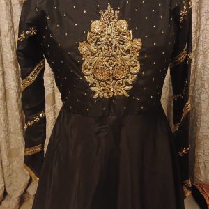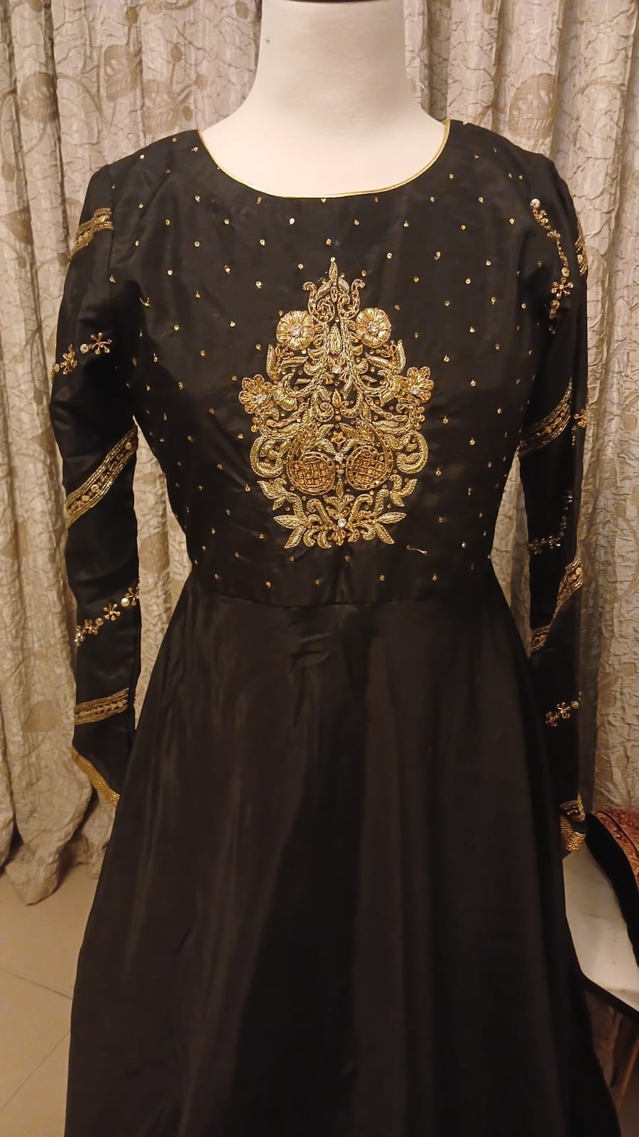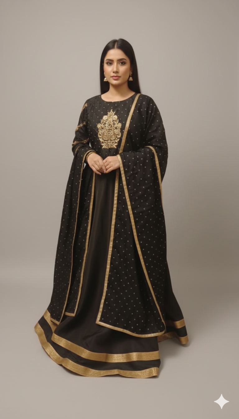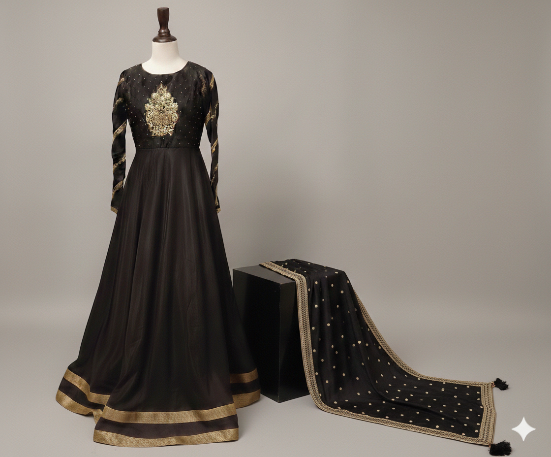 This elegant black ensemble is a timeless expression of regal grace and understated luxury. Crafted in a flowing silhouette, the dress features a rich black base adorned with delicate dotted detailing that adds subtle texture and depth. The highlight lies in the intricate gold embellishment on the bodice, inspired by classic heritage motifs, lending a royal and refined presence.