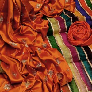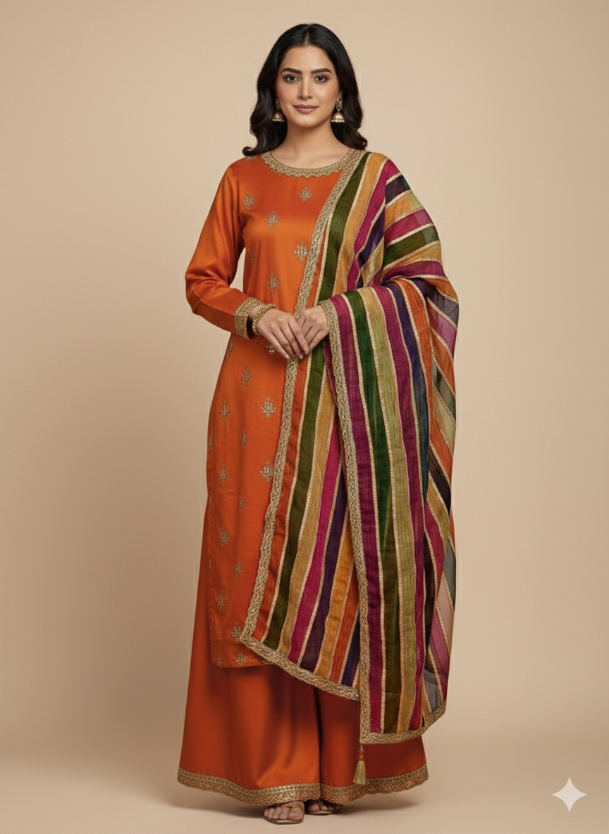 This graceful ensemble is a celebration of festive warmth and timeless tradition. The outfit features a rich rust-orange base, adorned with delicate gold motifs that add a subtle touch of shimmer and refinement. The classic straight silhouette offers effortless elegance, making it both comfortable and flattering.