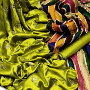 Paired with a striking multicolored striped dupatta, the look comes alive with vibrant hues of green, maroon, mustard, and gold. The dupatta is finished with an ornate gold border, adding texture and a festive charm that elevates the entire ensemble. Finished with matching wide-leg bottoms, this dress strikes a perfect balance between traditional artistry and modern sophistication.
